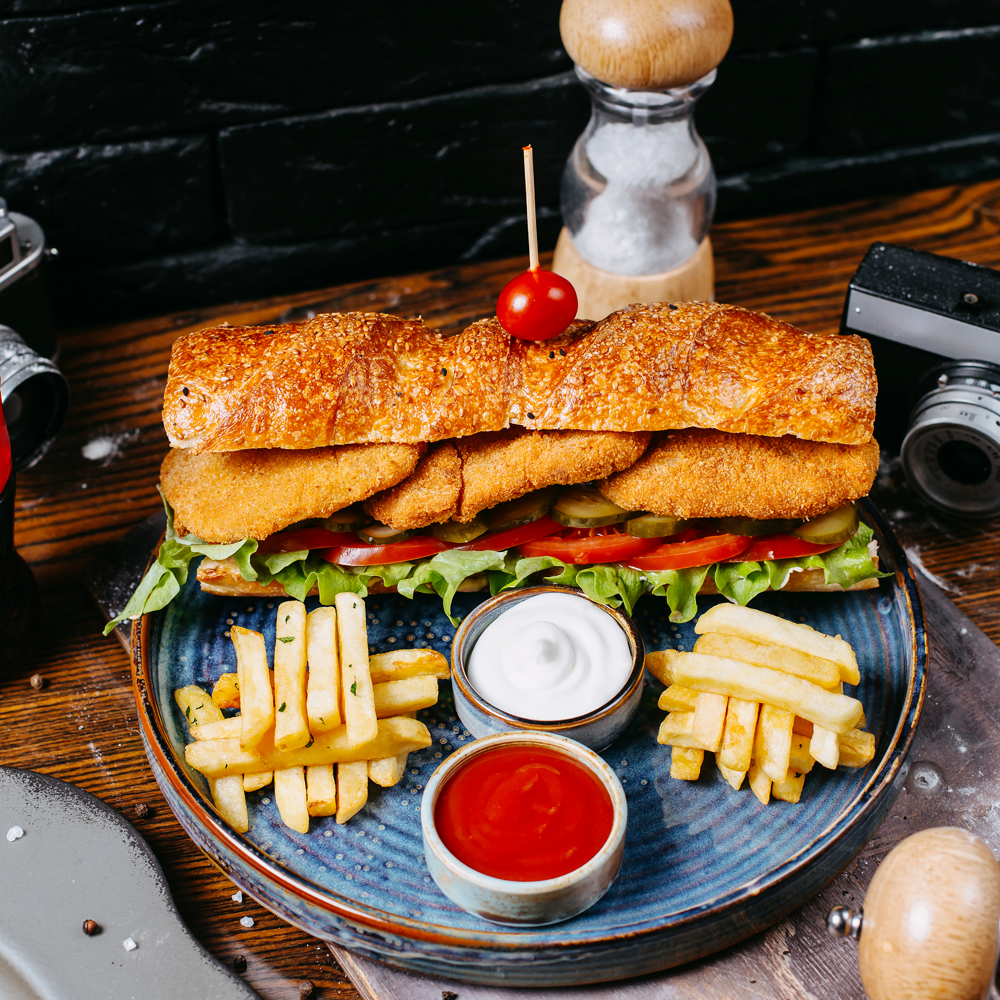 سندويشة واحدة مكونة من دجاج  -خضار -مخلل (تقدم مع بطاطا وباستا بالخضار)