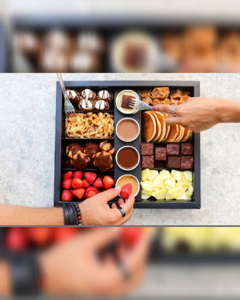 بوكس من البان كيك و قطع البروانيز و الفواكه مع مختلف أنواع صوص الشوكولا الشهية من محلات dipndip العالمية