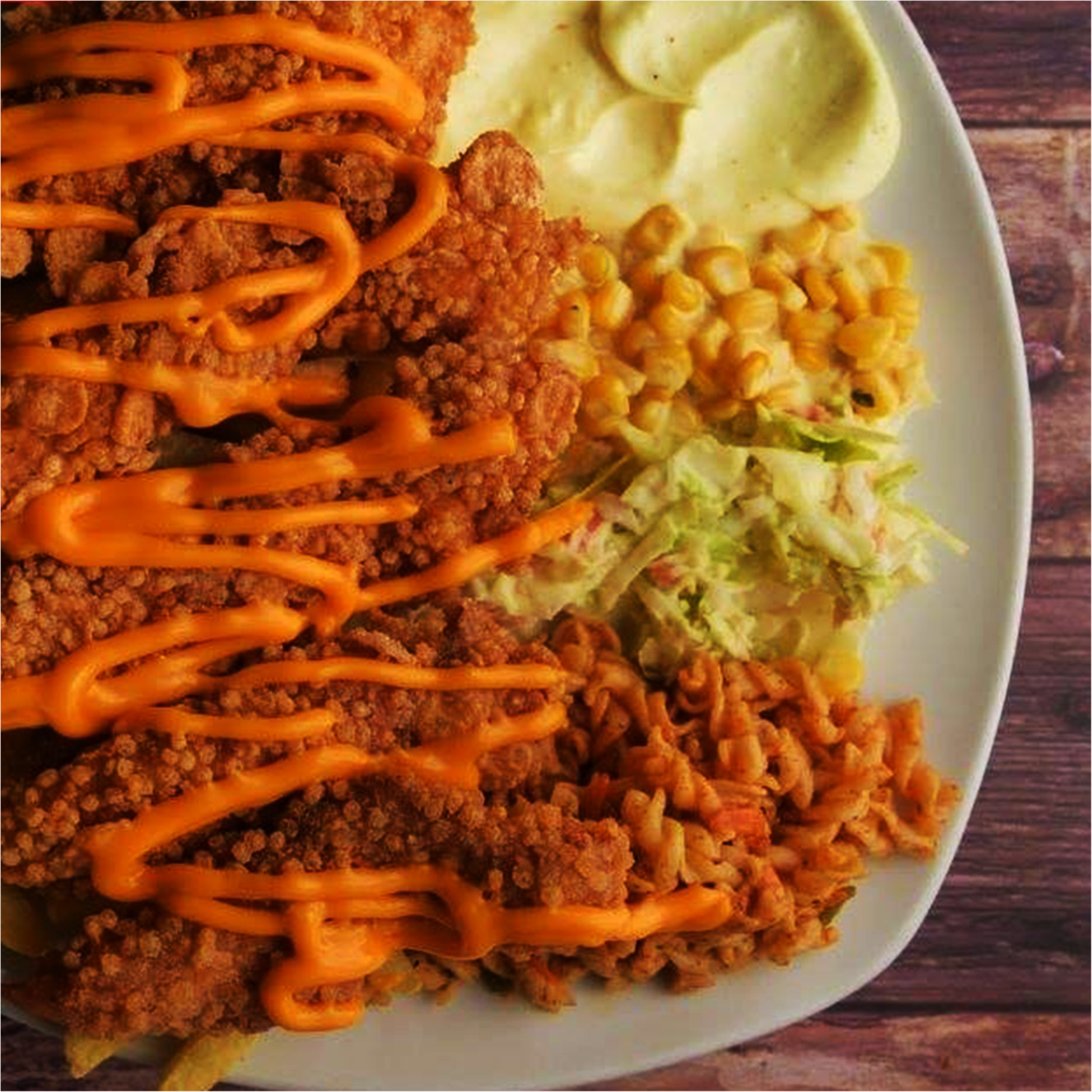 وجبة واحدة مكونة من دجاج مقرمش سلامي -جبنة تشيدر – ذرة (تقدم مع بطاطا وباستا بالخضار و كول سلو وسلطة ذرة و خبز)