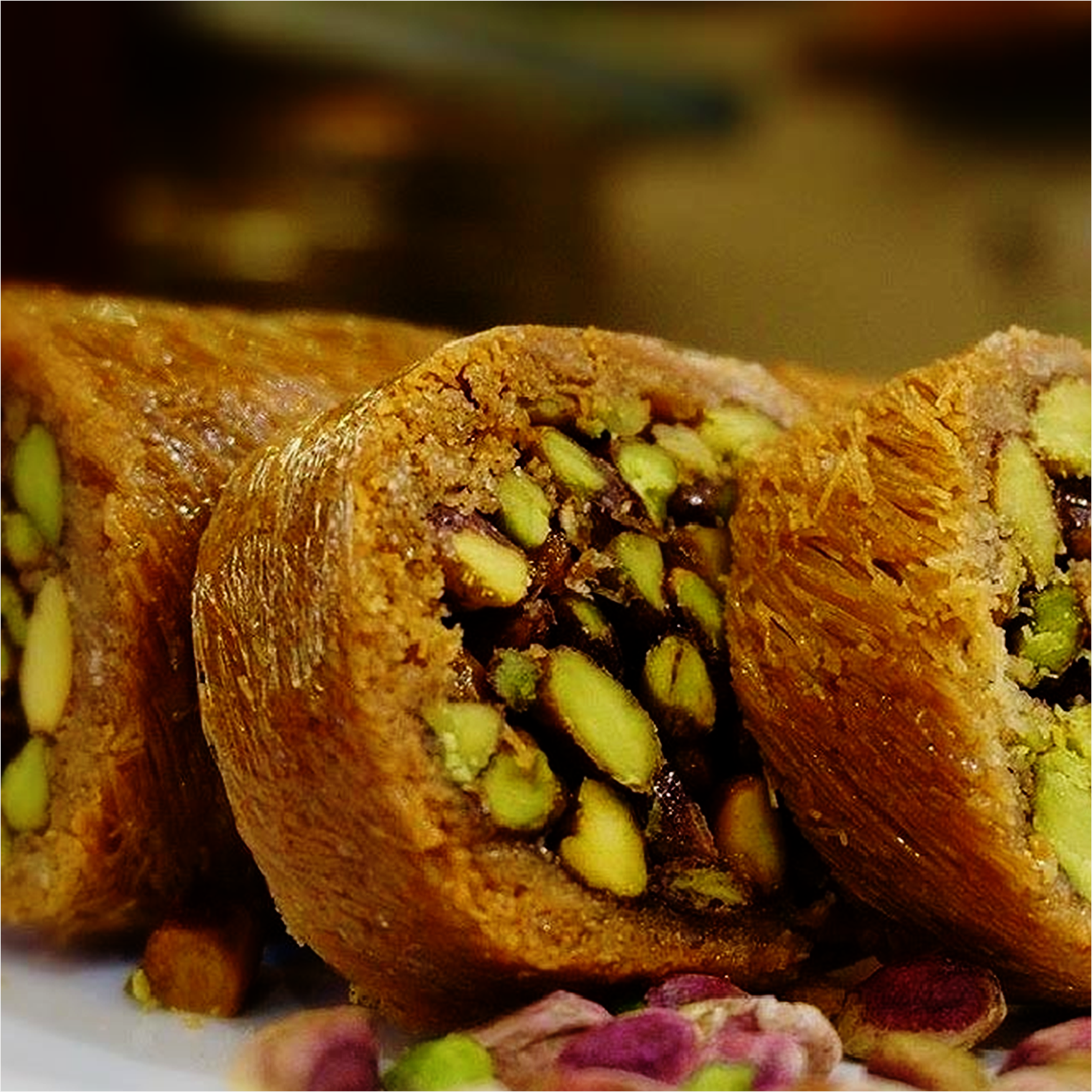 واحد كيلو غرام من حلويات المبرومة بالفستق الحلبي الفاخر و السمن العربي من محلات ديوان مهنا الفاخرة