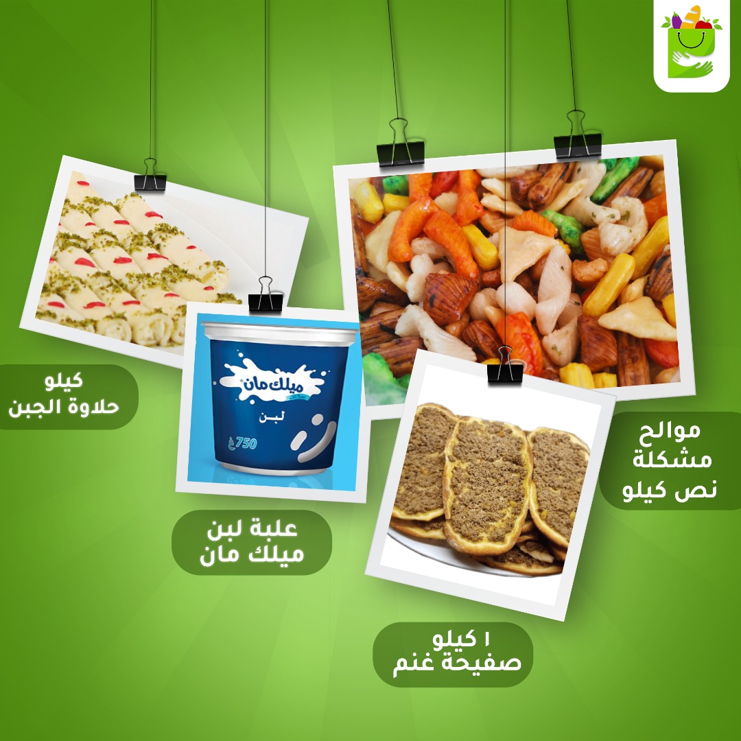 واحد كيلو غرام صفيحة غنم+واحد كيلو حلاوة الجبن + 500غرام موالح مشكلة +علبة لبن ميلك مان