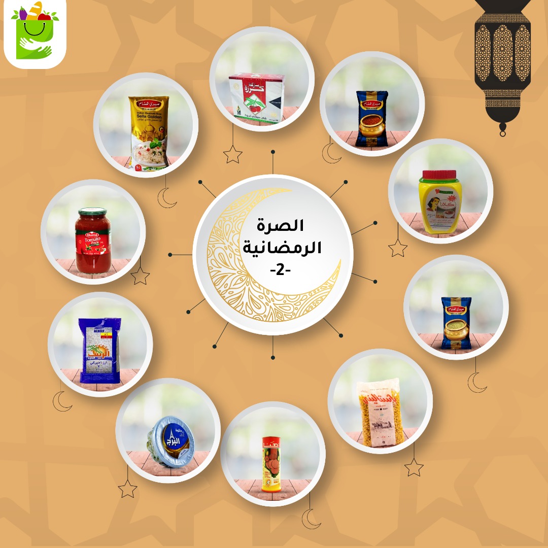 صرة رمضانية تتألف من : بوري مرتديلا هنا 840غ – علبة حلاوة البرج – 1ك رز الربف – دبس بندورة 1300غ – رز كبسة 1ك – شاي سيدي هشام 500 غ -عدس أسود سيدي هشام 1ك – 1ك سمنة كلارا -برغل خشن سيدي هشام 1ك – معكرونة باستاليني 1ك