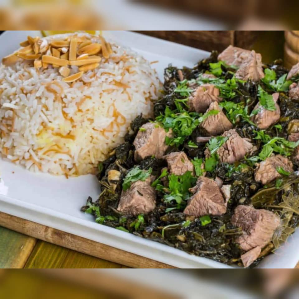 طبق من الملوخية الشهية باللحمة مع صحن من الأرز تكفي شخص واحد من محلات السماح