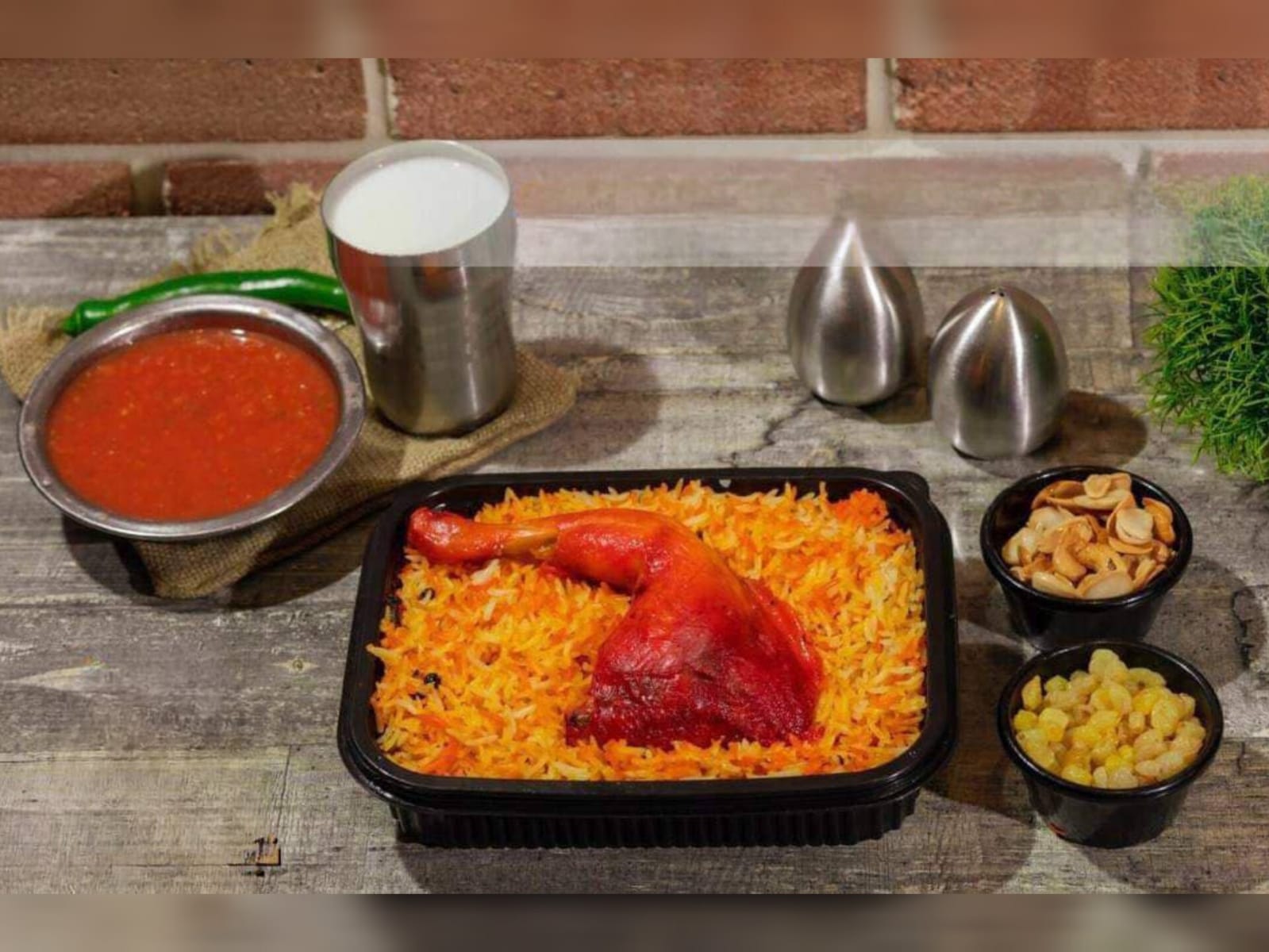 وجبة إفطار لشخص واحد مؤلفة من رز مندي و ربع فروج مع صلصة دقوس و لبن العيران من محلات مندي نجمة حضرموت المعروفة