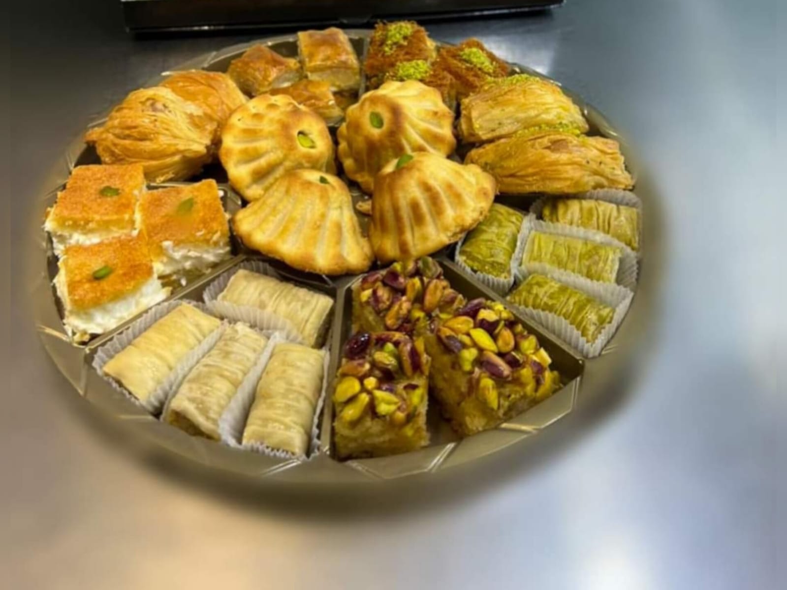 صحن يحتوي على قطع متنوعة من الحلويات الرمضاتية المحشوة بالقشطة و الفستق الحلبي من محلات الوسام المتميزة