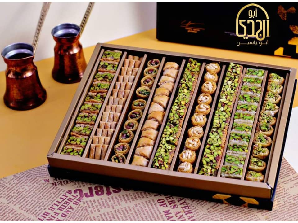 500 غرام من الحلويات الشرقية المشكلة بالفستق الحلبي و الكاجو المصنوعة بالسمن العربي من محلات أبو الجدي العريقة